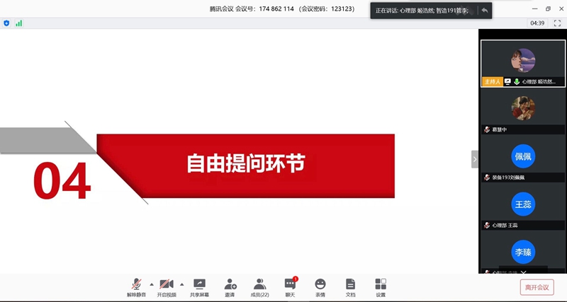 2020年5月10日19:00-20:30,万博max官网心理部通过腾讯会议开展“共筑暖心团队”主题线上心理委员培训会,本次培训会由心理部部长姬浩然主持,心理部成员及2019级班级心理委员参会。